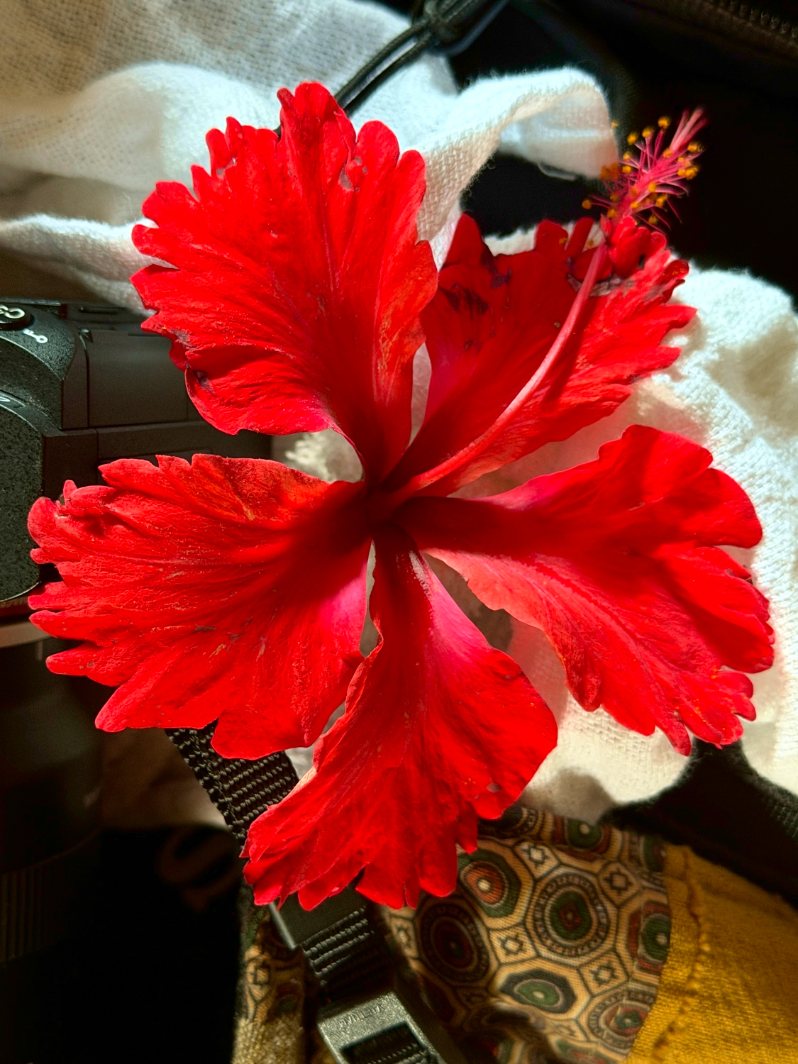 両膝の前に置いたバックパックの上に一輪のハイビスカス?